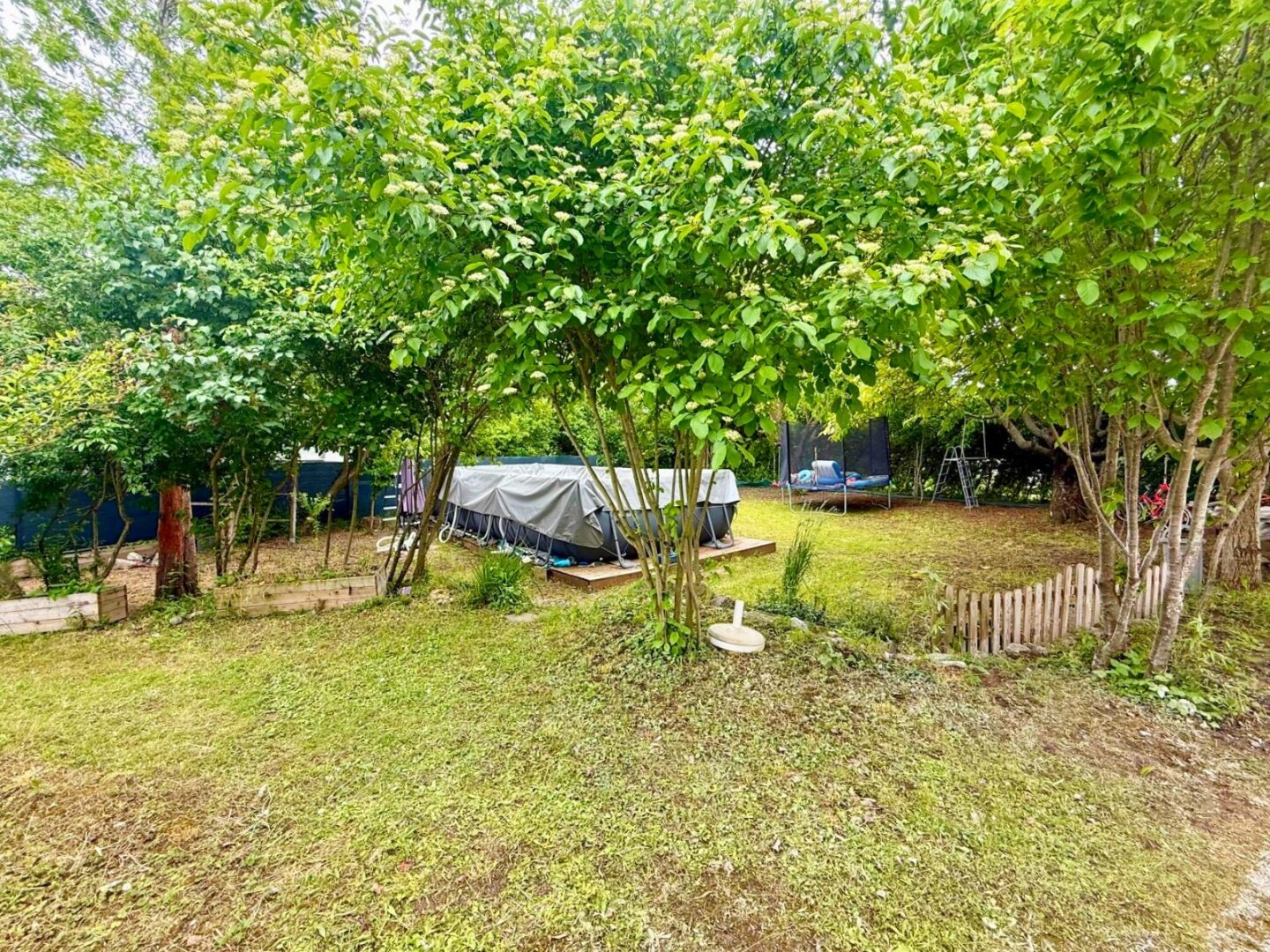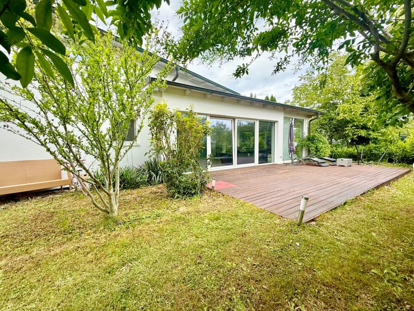 Der rund 600 m² große, nutzbare Garten eröffnet zusätzliche Freiräume für Spiel, Entspannung und Naturerlebnis.